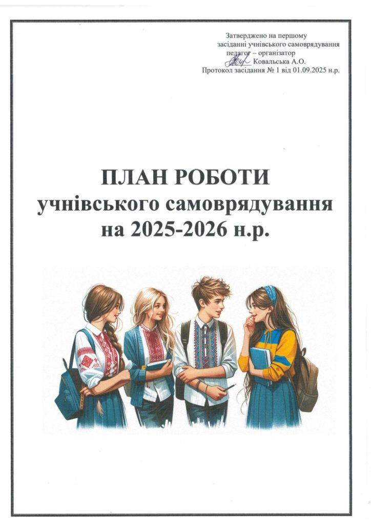 Учнівське врядування План роботи Козацька республіка План роботи учнівського самоврядування на 2025-2026 н.р. Share Facebook Twitter Pinterest Linkedin